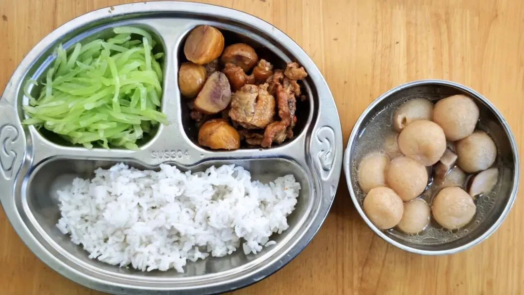 板栗烧鸡、清炒莴笋、香菇鱼饼汤