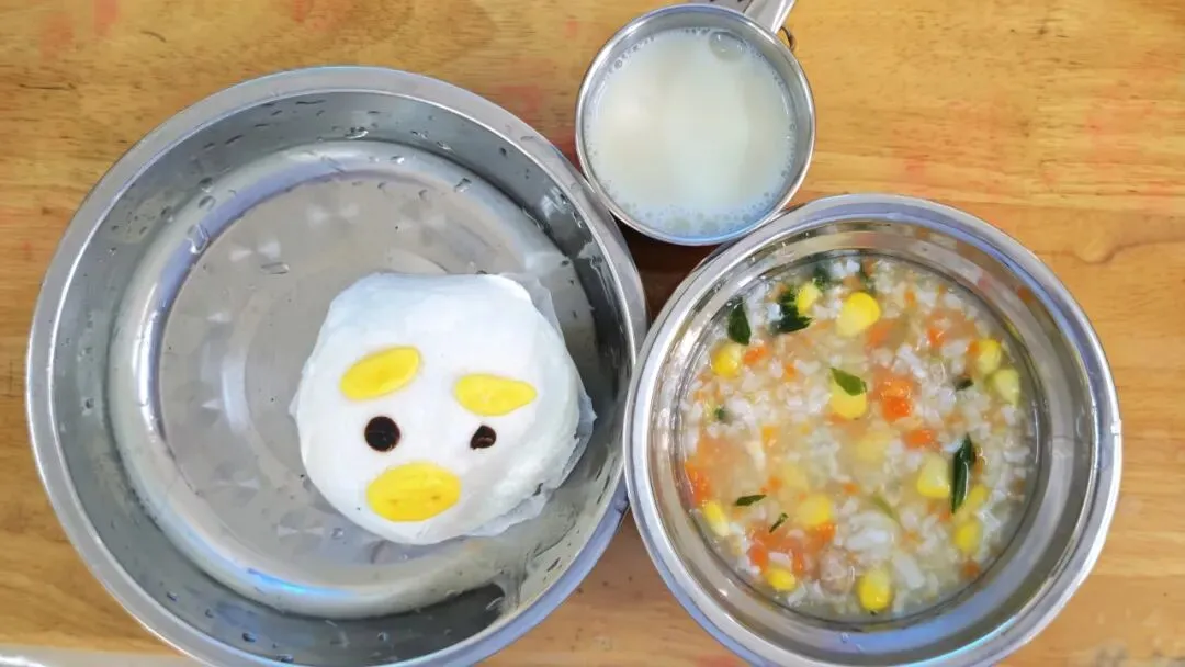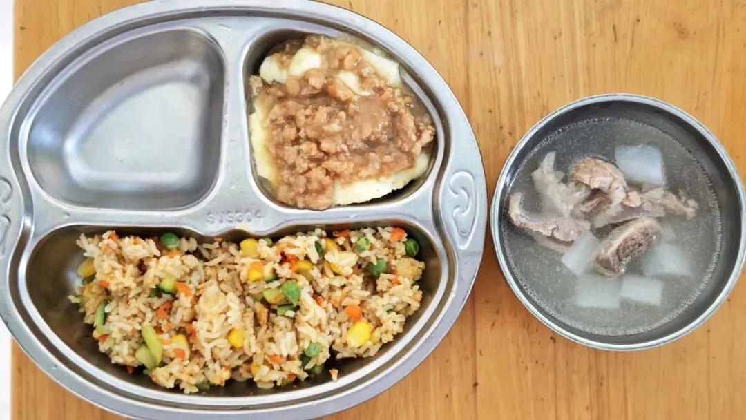 五彩拌饭、肉沫蒸蛋、白萝卜大骨汤