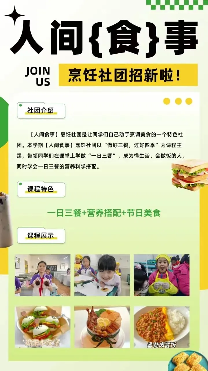 本学期【人间食事】烹饪社团以“做好三餐,过好四季”为课程主旨,带领同学们在课堂上学做“一日三餐”,成为懂生活、会做饭的人,同时学会一日三餐的营养科学搭配。