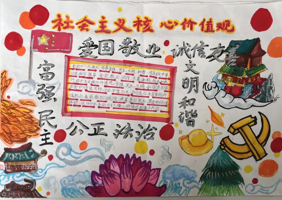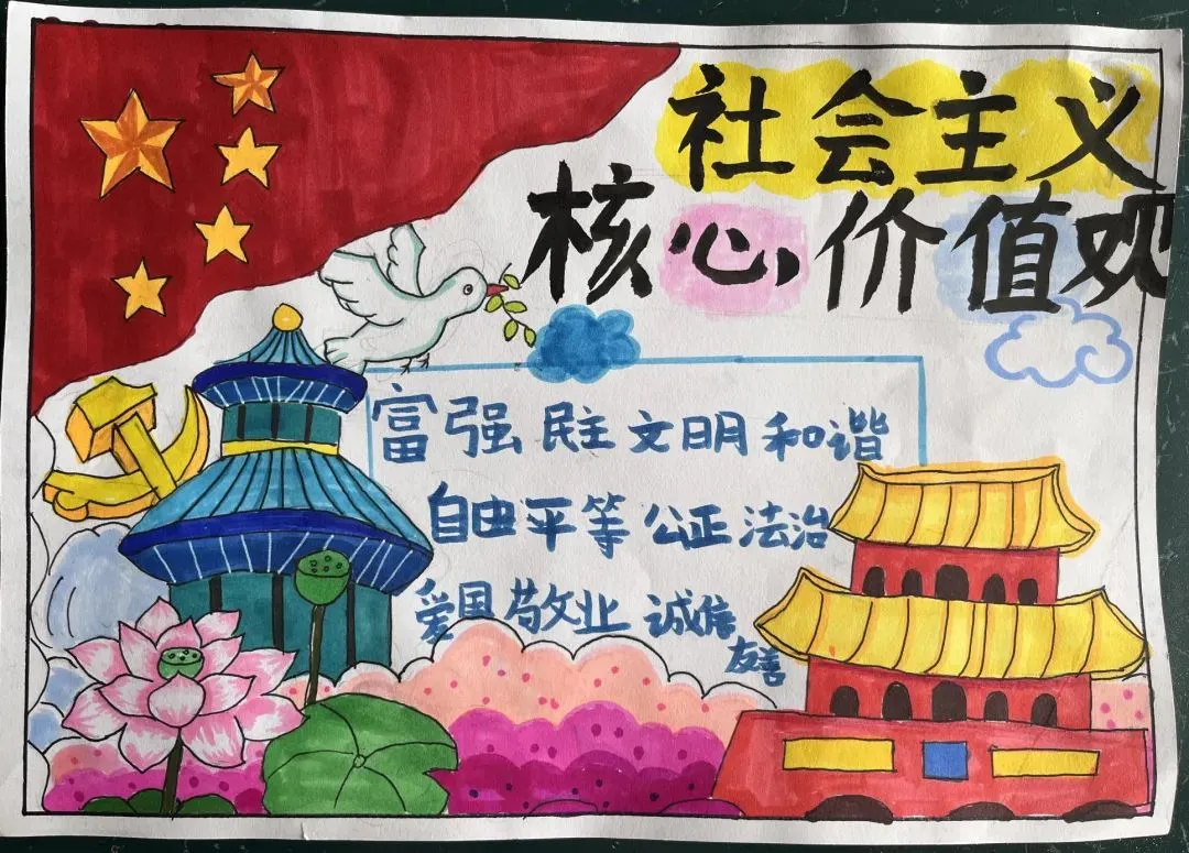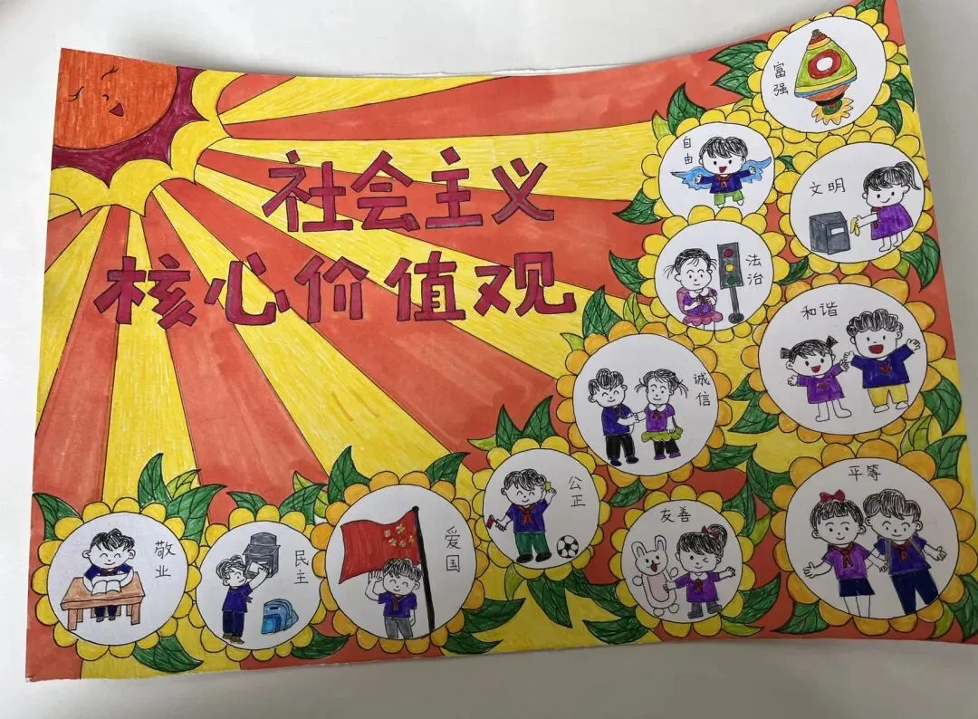 同时,道法老师在道德与法治课上,带领同学们诵读核心价值观相关内容,做到入脑入心。童画文明城,手绘新时代。同学们从不同的视角展示社会主义核心价值观的精神内涵,描绘自己身边的文明新风尚,用鲜艳亮丽的色彩、丰富多彩的内容,表达着自己对祖国的美好祝福,共绘美丽蓝图。