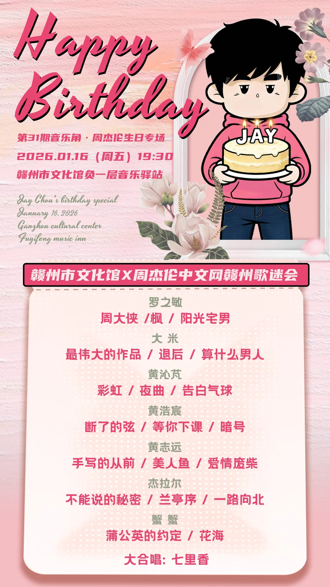赣州的杰迷们集合!赣州市文化馆联动周杰伦中文网赣州歌迷会,重磅打造音乐角周杰伦生日专场,一场满载青春回忆的音乐派对即将开唱!熟悉的旋律、限定的周边、热血的合唱,邀你共赴这场专属于杰迷的浪漫之约!