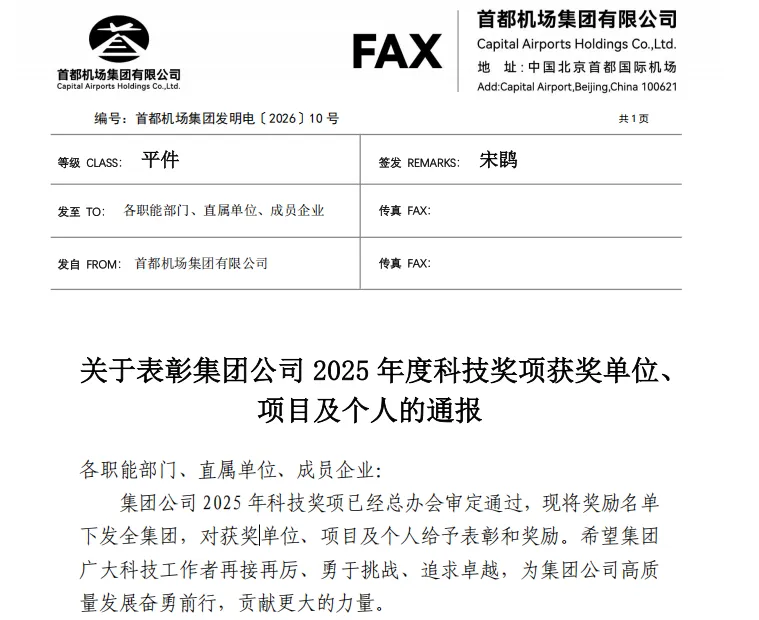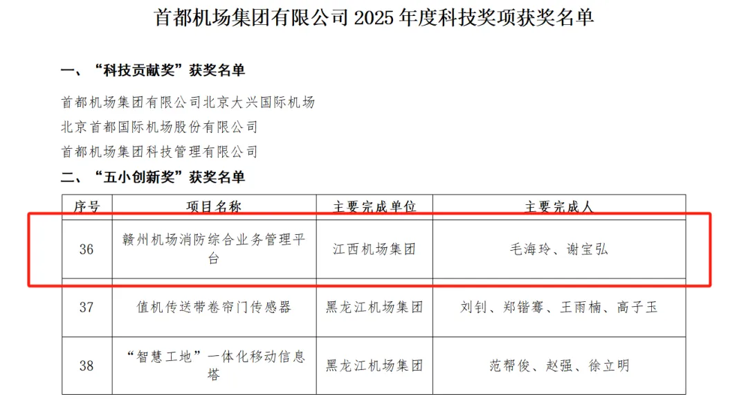 近日,首都机场集团有限公司正式公布2025年度科技奖项获奖名单,赣州机场研发的“消防综合业务管理平台” 项目荣获首都机场集团有限公司2025年度“五小创新奖”!这一荣誉不仅是对项目技术价值与应用成果的高度认可,更生动彰显了赣州机场立足岗位深耕创新、以技术赋能安全保障的实干担当与创新底色。