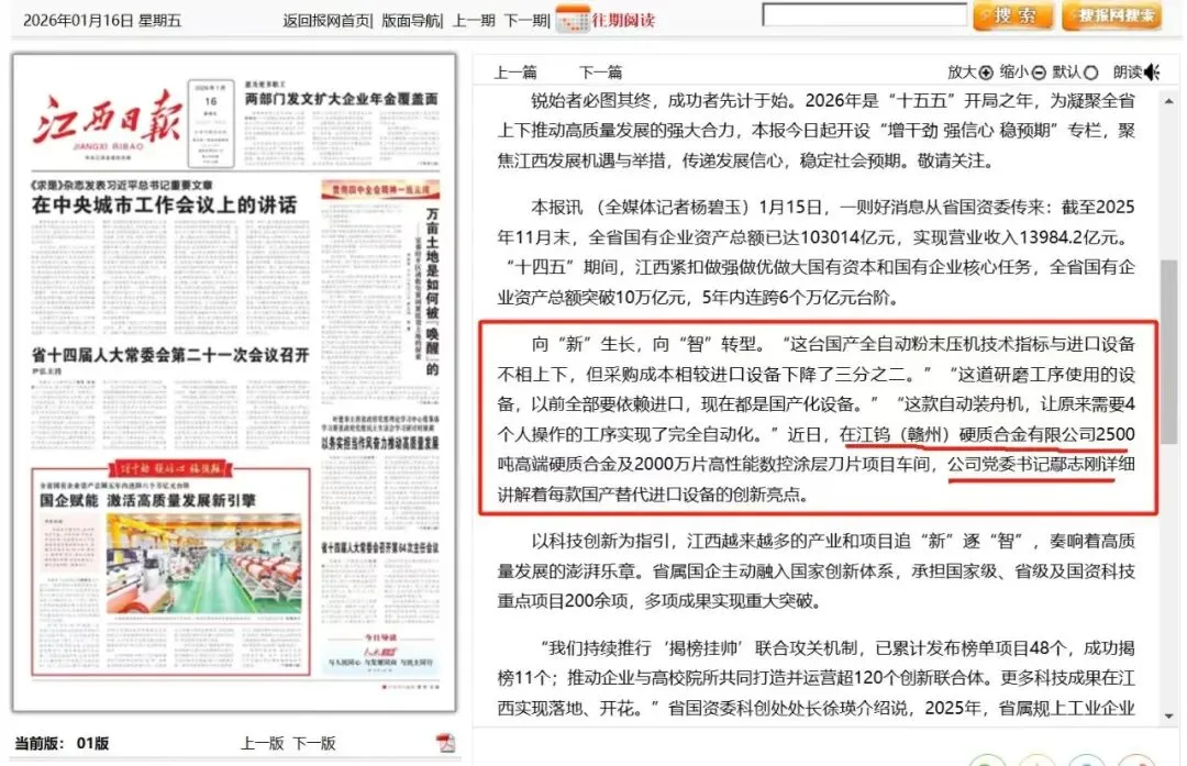 向“新”生长,向“智”转型。“这台国产全自动粉末压机技术指标与进口设备不相上下,但采购成本相较进口设备下降了三分之二。”“这道研磨工序使用的设备,以前全部要依赖进口,现在都是国产化设备。”“这款自动装舟机,让原来需要4个人操作的工序实现了完全自动化。”近日,在江钨(赣州)硬质合金有限公司2500吨高端硬质合金及2000万片高性能数控涂层刀片项目车间,公司党委书记鄢志刚详细讲解着每款国产替代进口设备的创新亮点。