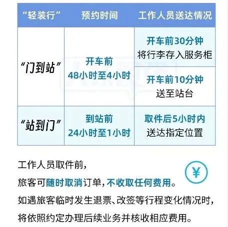到达旅客“站到门”行李搬运服务。办理由车站到目的地的业务,可在列车到站前24小时至1小时进行预约,工作人员在取件后5小时内送达指定位置。