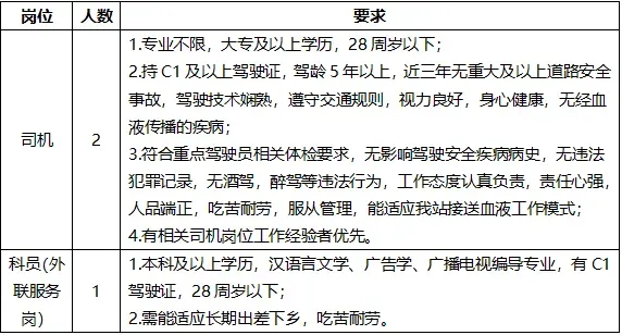 声明:本微信公众号刊载此文,无任何商业目的,纯属公益转发,目的是架起求职者和用人单位之间的桥梁,传递更多的招聘就业信息,请您找工作时候务必高度警惕各类求职陷阱。若来源标注错误或侵犯了您的合法权益,请及时与我们联系,我们将及时更正、删除或依法处理,微信号(含:商务合作):sqdzry。赣州市中心血站是隶属于赣州市卫生健康委的公益性卫生事业单位(以下简称“中心血站”),是赣州市唯一的采供血机构,与赣州市临床检验中心合署办公。