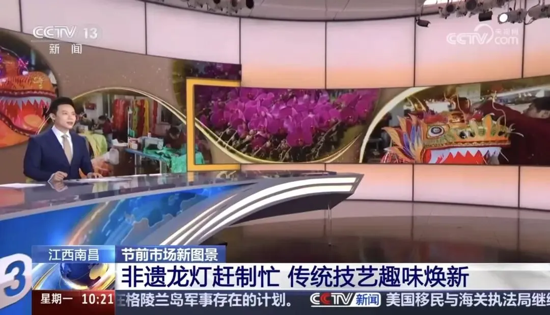 1月12日,央视《新闻直播间》报道:随着春节的临近,近段时间江西南昌的一处龙灯生产基地迎来产销旺季,非遗技艺也在不断地推陈出新。在龙灯生产基地,工人们正忙着扎龙头、糊龙身、缝龙鳞,全力赶制订单。工作人员介绍,这里平均每天要生产30多条龙灯成品,发往全国各地及海外。