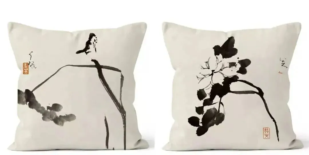 八大山人水墨抱枕系列文创产品创意设计取材于八大山人写意花鸟画中所绘的荷花翠鸟与牡丹花等造型元素,既蕴含了八大山人书画艺术精髓,又体现了现代设计中的形式美和装饰意味,颇具时代感。产品采用江西传统的苎麻面料制作,为家居生活增添美意,让八大山人书画艺术融于生活之中。