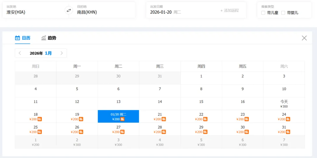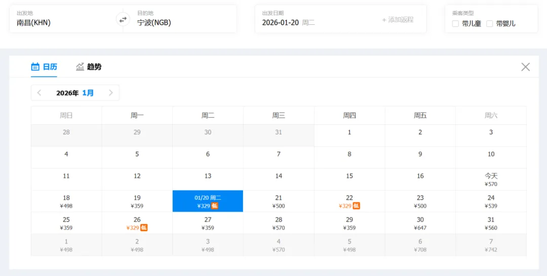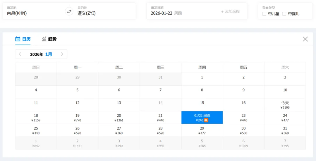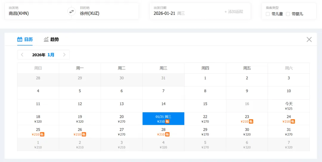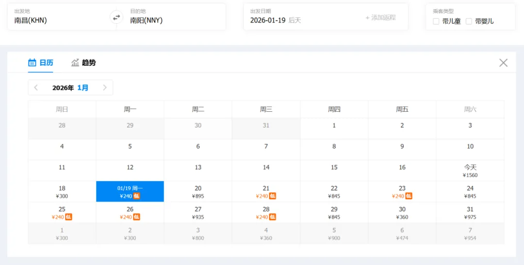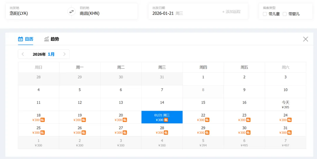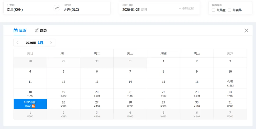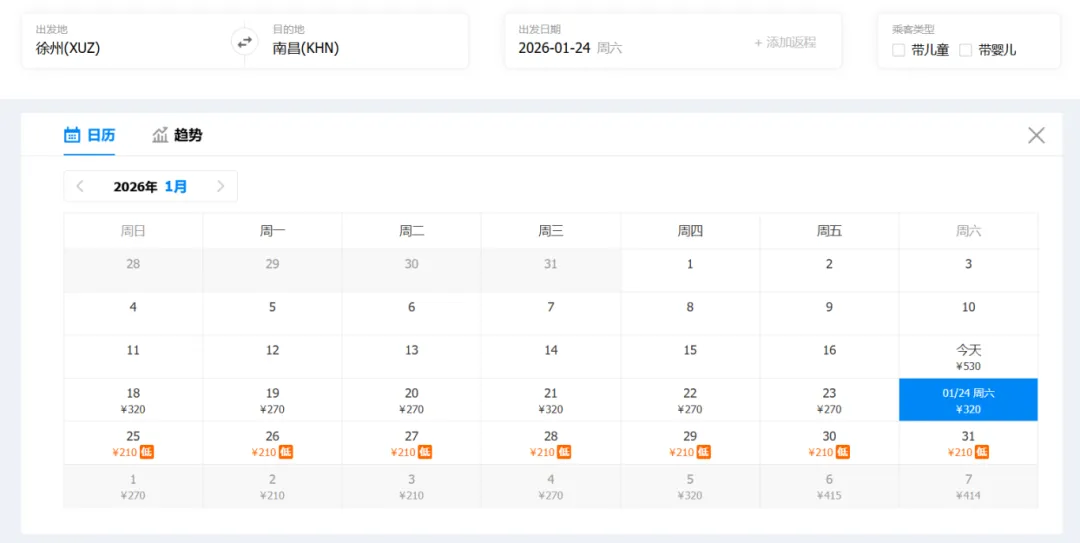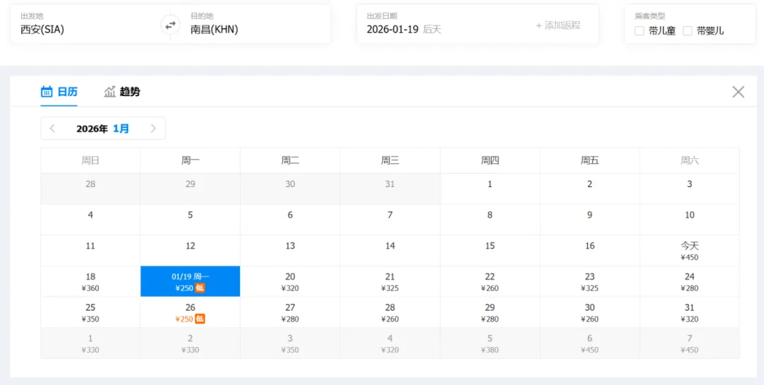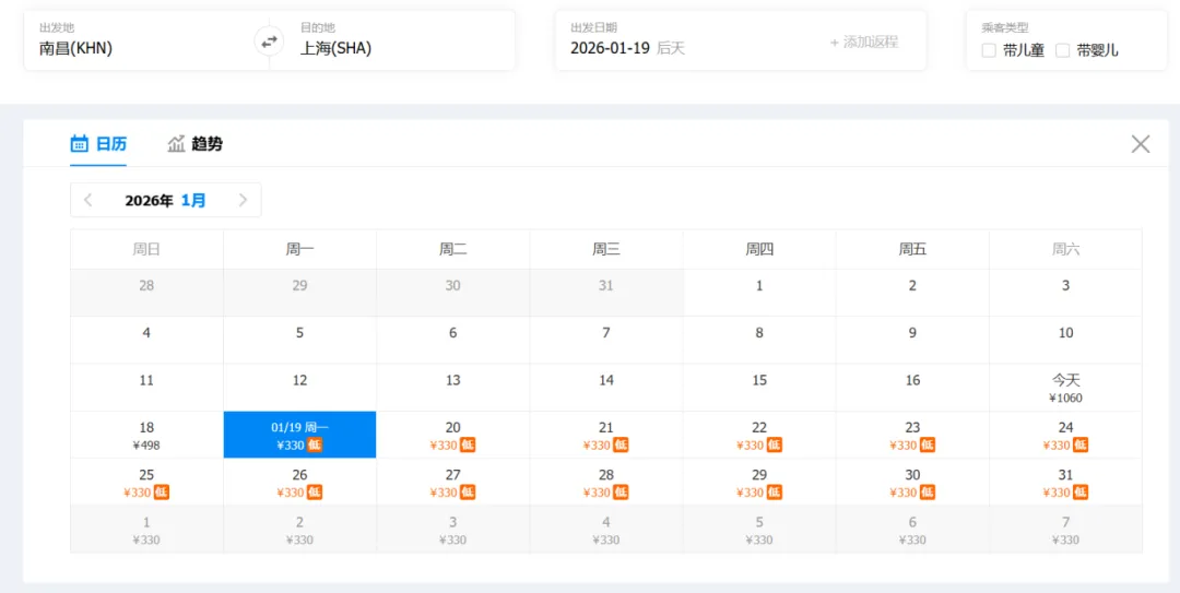 ①“去程最低价/返程最低价”指的是2026年1月17日-1月31日期间特价机票。