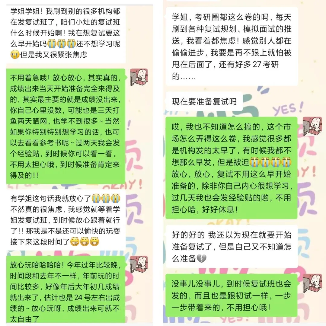 那我今天为什么要发这个推文呢?主要是因为太多同学问啦,我发这个推文也是为了给大家一颗定心丸!!!因为很多同学对复试不熟悉,看到和考研复试相关的字眼就非常焦虑,像个无头苍蝇一样乱撞。所以希望这个推文可以减缓你的焦虑,给你信心!!但真的别急,属于复试的战场还没到开启时间。现在的你,最该做的就是:好好吃饭,好好休息,好好享受这段不用被书本绑架的日子。等分数出来,咱们再铆足劲儿冲!【后面也会给出这个阶段的学习建议哦(如果真的特别想学的话)】