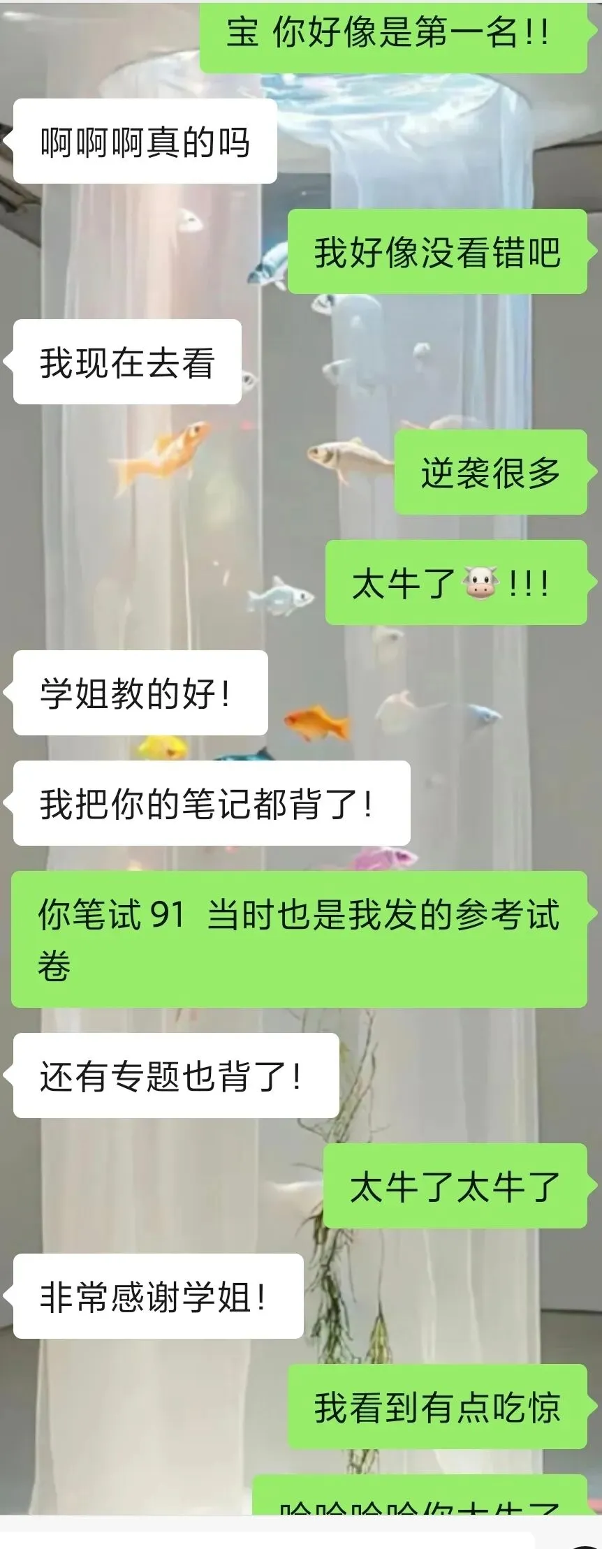 而且咱们这儿的逆袭案例真的一抓一大把,有像之前说的初试倒数第六,最后逆袭成总成绩第一的狠人;也有从十几名一路冲到前五的黑马;类似的高光时刻还有好多好多!所以只要你肯用心准备,不管初试排名怎么样,都有机会逆风翻盘!