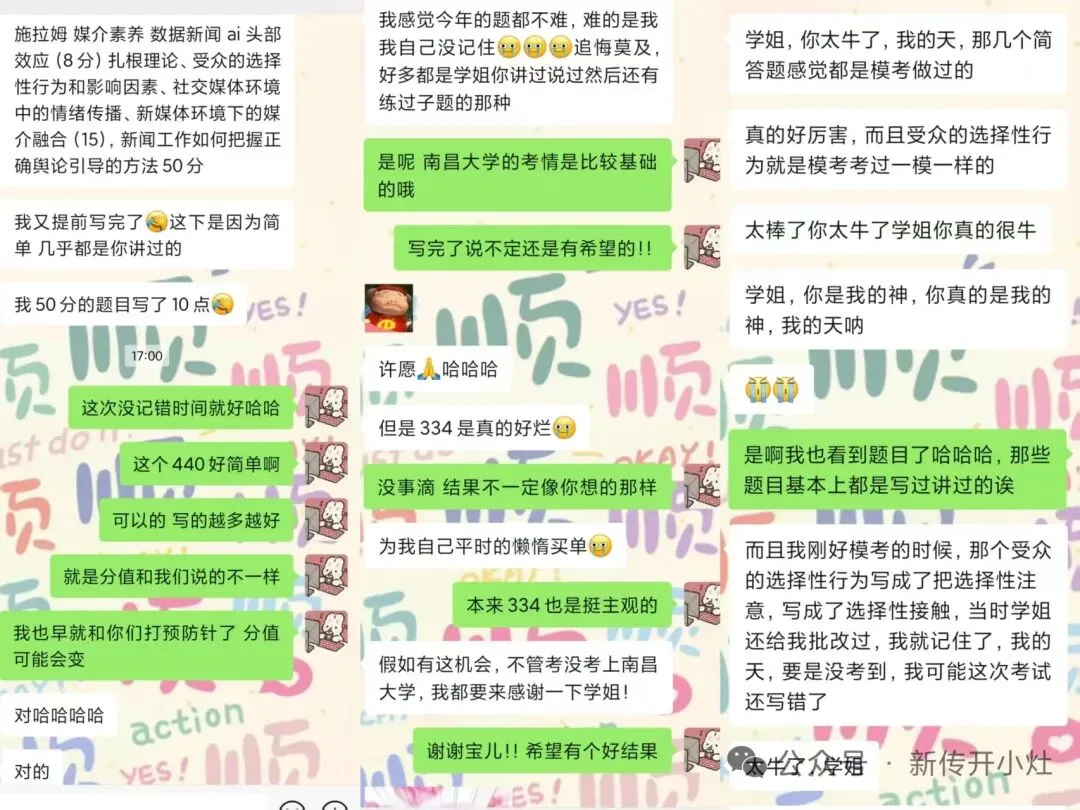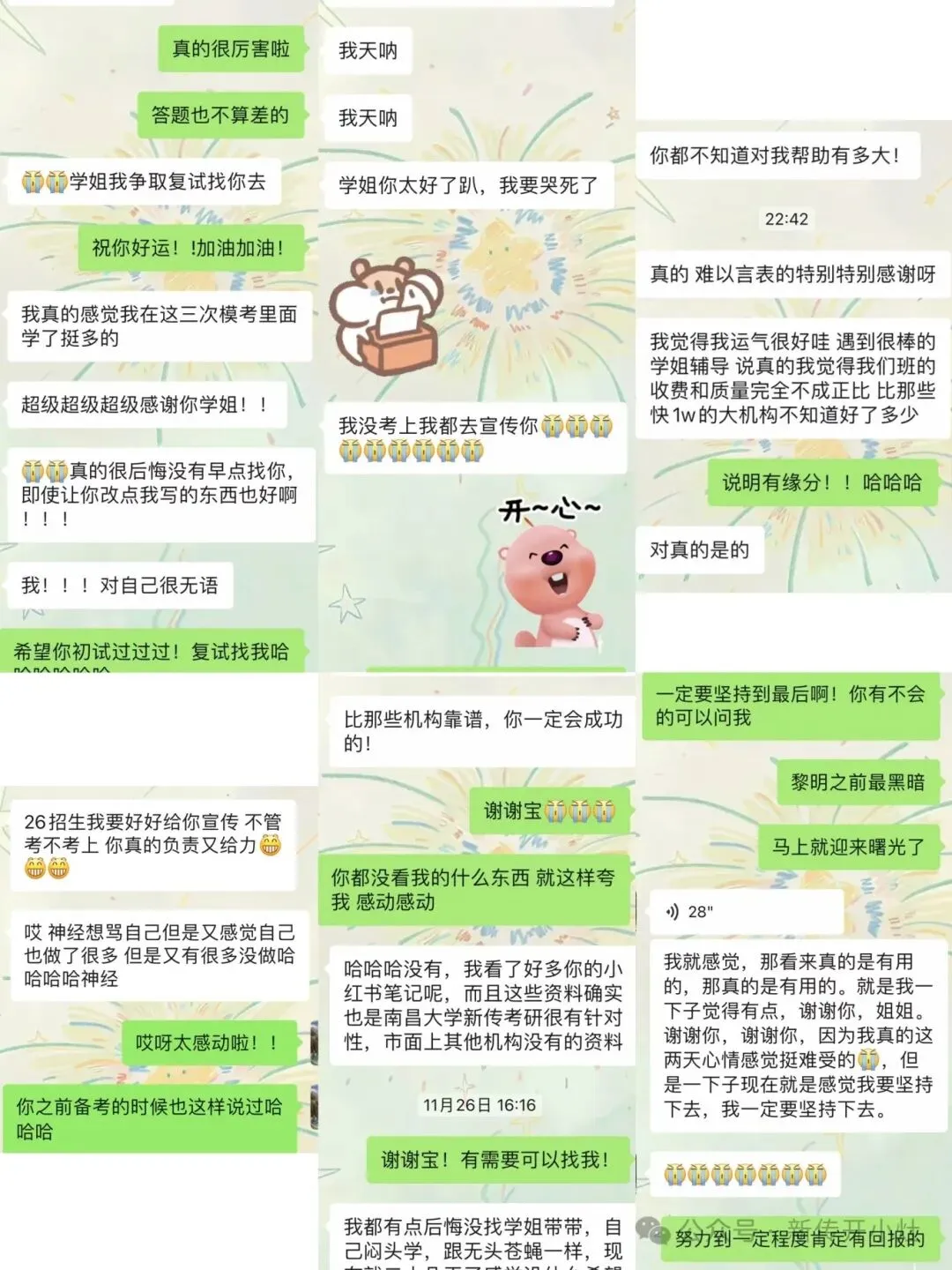 我始终相信真诚才是必杀技!一直以来真心实意地对待每一位同学,也相信大家都有自己的判断和分辨能力。这几年深耕新传考研辅导,从初试到复试,我陪着一届又一届同学走过这段满是挑战的备考路,也收获了太多珍贵的好评与认可。