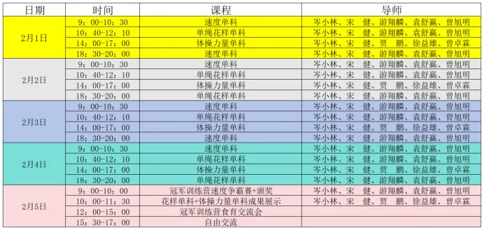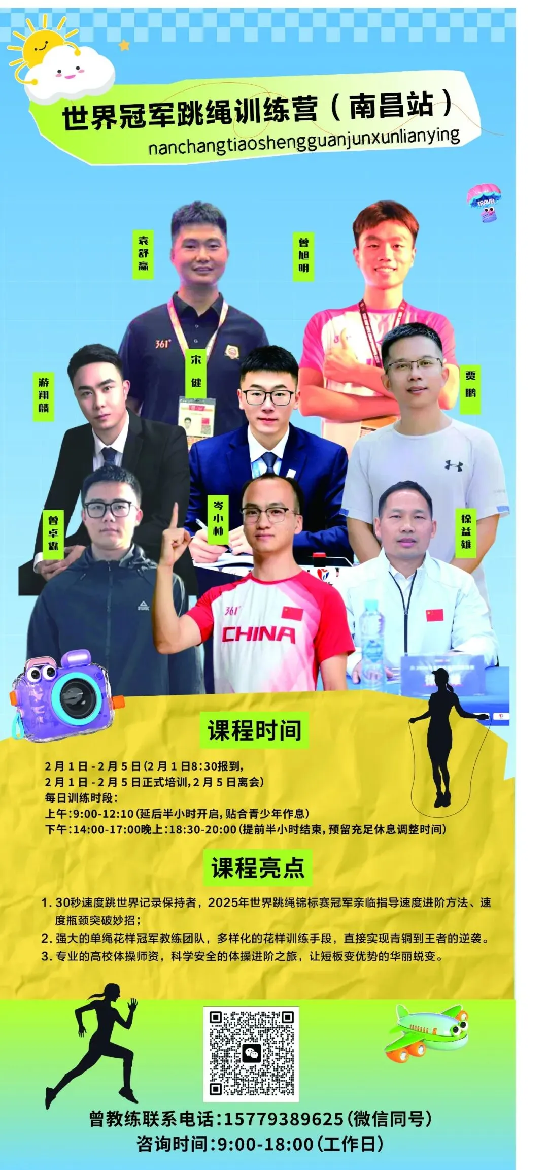 江西省南昌市青山湖区学院路265号南昌师范学院附属中学能力要求:不限基础,无论是入门新手想夯实基础,还是进阶选手想突破瓶颈、解锁花样技巧,均可报名参与。四、课程安排本次训练营采用“速度+ 花样 + 体操力量” 双轨教学模式,兼顾速度提升与花样创新,搭配趣味赛事与成果展示,让训练更具针对性和趣味性:宋健:高校体育教师/华东师范大学硕士、中国跳绳国家队教练组成员、《2025-2028全国跳绳运动竞赛规则》编委、国际级跳绳裁判员、全国跳绳高级教练员、全国跳绳教练员裁判员培训讲师、全国跳绳十佳鹰眼裁判、全国跳绳优秀裁判员、全国跳绳优秀教练员、世界跳绳锦标赛裁判、全国跳绳联赛裁判长、全国跳绳段位挑战赛裁判长、全国跳绳联赛冠军、中国大学生跳绳联赛冠军岑小林:世界跳绳冠军、训练营总教练、4项世界纪录保持者,在世界跳绳锦标赛中累计斩获男子单摇、团体全能等多项冠军,2025 年助力中国队实现男子团体全能冠军的历史性突破。贾鹏:江西师范大学副教授,国家级社会体育指导员,跳绳高级教练员,体操一级裁判员,体操二级运动员,曾代表江西师范大学获江西省第14届运动会体操比赛男子甲组个人全能金牌,指导学生在全国大学生跳绳锦标赛、全国跳绳锦标赛、总决赛、联赛等国家级赛事中获金牌100余枚,个人获得“优秀教练员”称号。徐益雄:南昌师范学院副教授、全国跳绳培训高级讲师、体操国家一级裁判员、体操国家二级运动员、全国跳绳高级教练员、全国跳绳国家级裁判员、全国跳绳高级晋段官、全国跳绳段位制委员会委员南昌师范学院教师,武汉体育学院运动训练专业硕士毕业,体操二级运动员,一级裁判员。第九届湖北省高校体操比赛团体冠军,花样跳绳全国联赛分站赛、总决赛冠军。