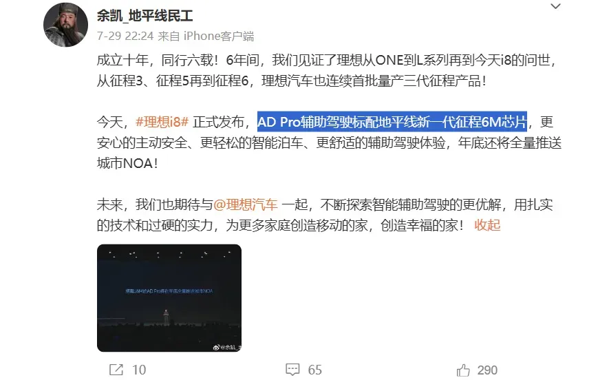 7月29日晚10点,理想i8发布会一结束,他就第一时间发布祝贺微博,称该车的ADPro辅助驾驶系统,标配征程6M芯片。