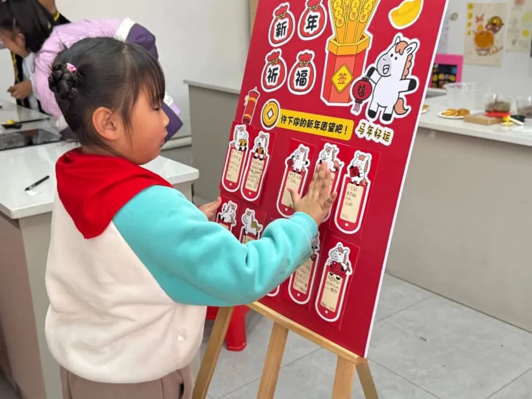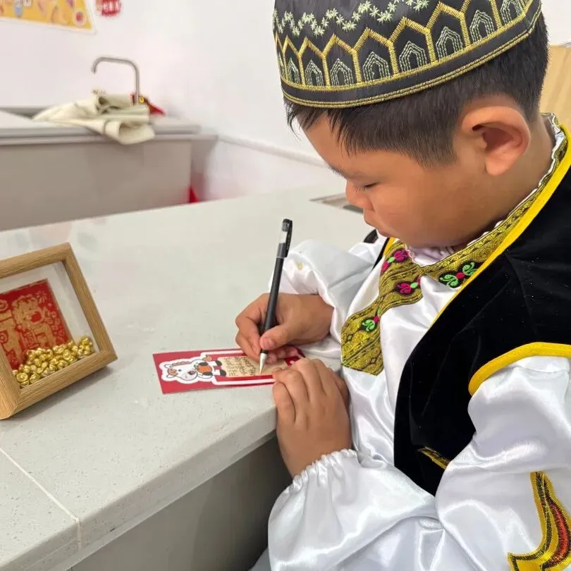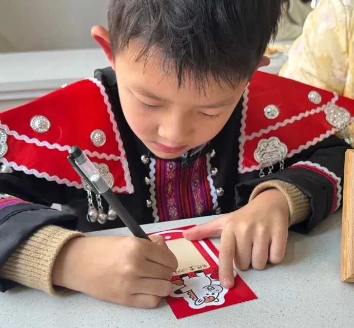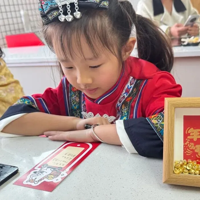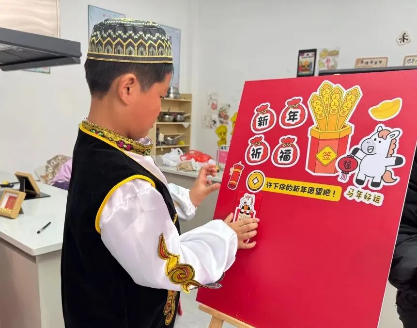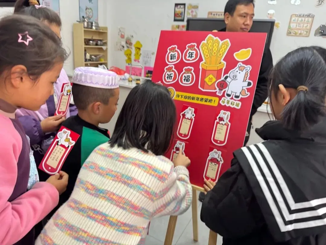 活动尾声,心愿祈福环节将氛围推向高潮。孩子们手持精致的心愿卡片,认真写下自己的新年期许:“希望家人平安健康,民族团结一家亲”“愿新的一年学业进步,认识更多好朋友”“祝老师和同学们新年快乐,万事顺意”……稚嫩的字迹里满是真诚的祝福。