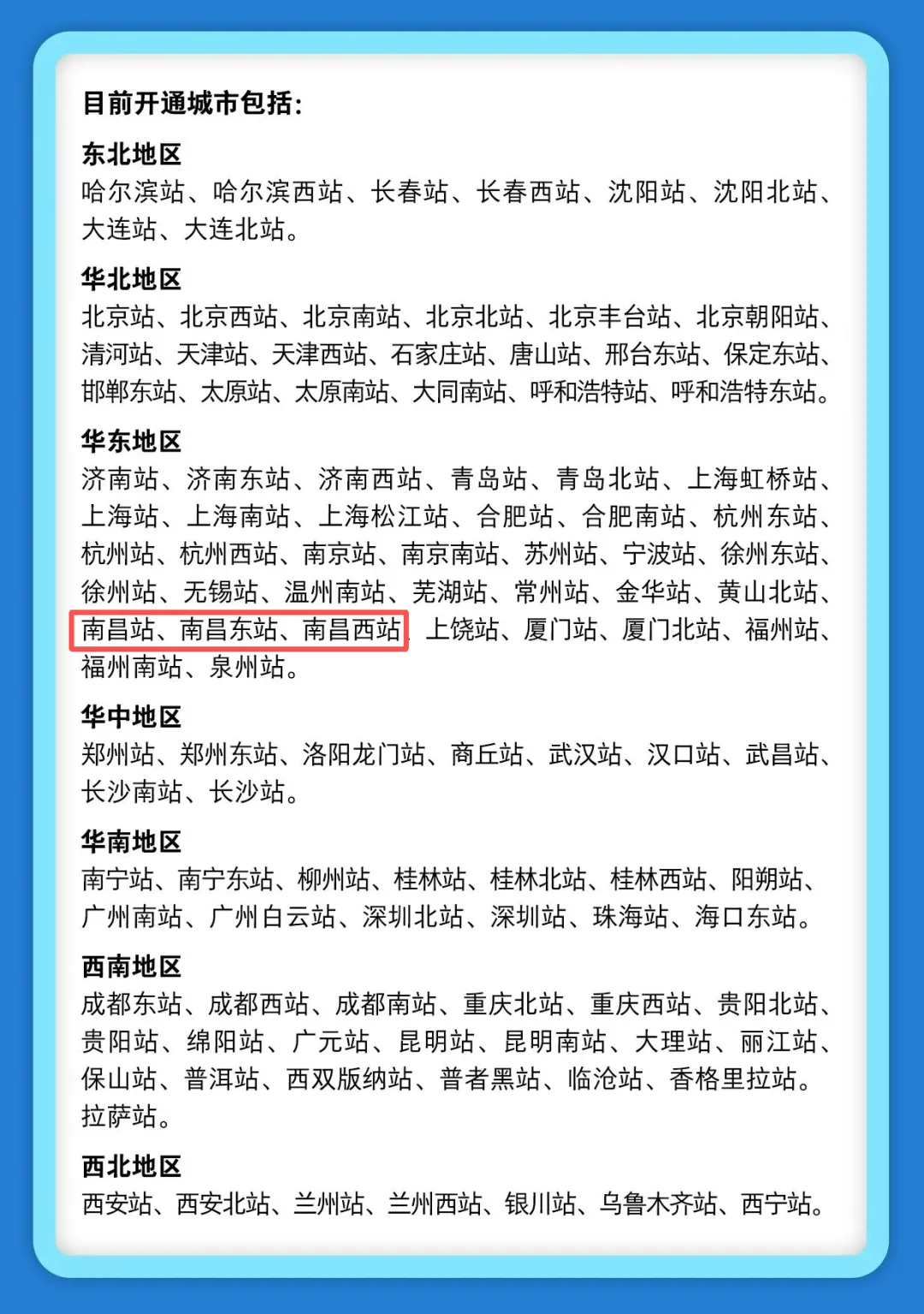 南昌范围内,南昌站、南昌东站、南昌西站均开通了该服务