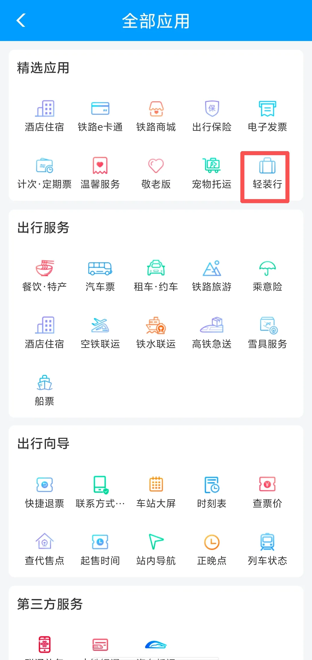2️⃣在全部应用中点击“轻装行”,进入预约页面