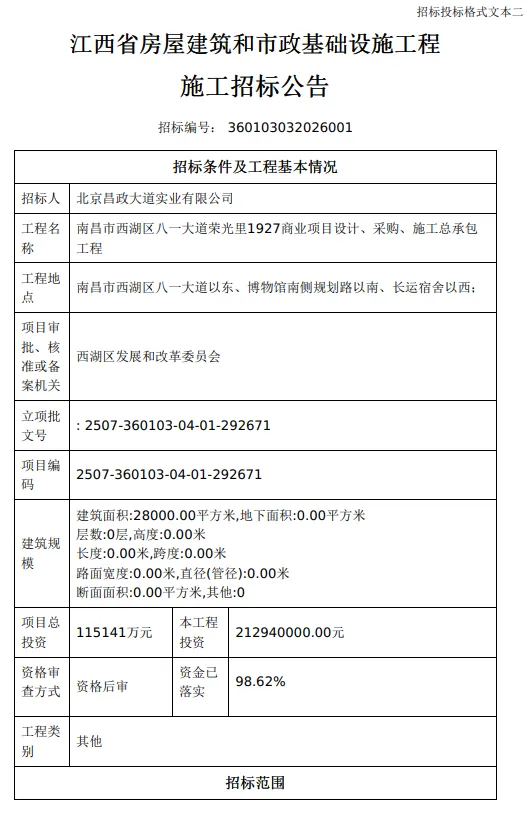 英雄城南昌,即将迎来一个全新的城市文化地标。近日,备受瞩目的 “八一大道荣光里1927商业项目” 正式启动设计、采购、施工总承包(EPC)招标。
