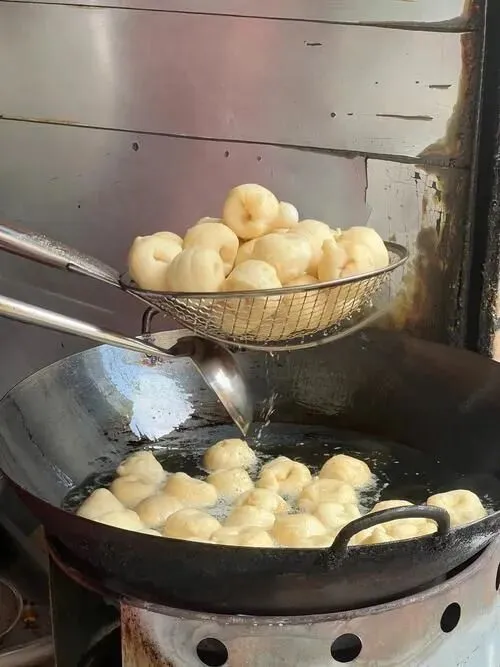第三样,白糖糕。路边摊现炸,面团发酵后切成菱形块,滚油里炸到金黄,捞出来外壳脆的掉渣,咬开里头是蜂窝状的软芯,嚼起来粘牙带劲。2块钱3个,烫手的时候往嘴里塞,甜味不腻,带股发酵的微酸。本地人拿这个当下午茶,配杯豆浆,坐在街边小板凳上,看人来人往,比啥咖啡厅都自在。
