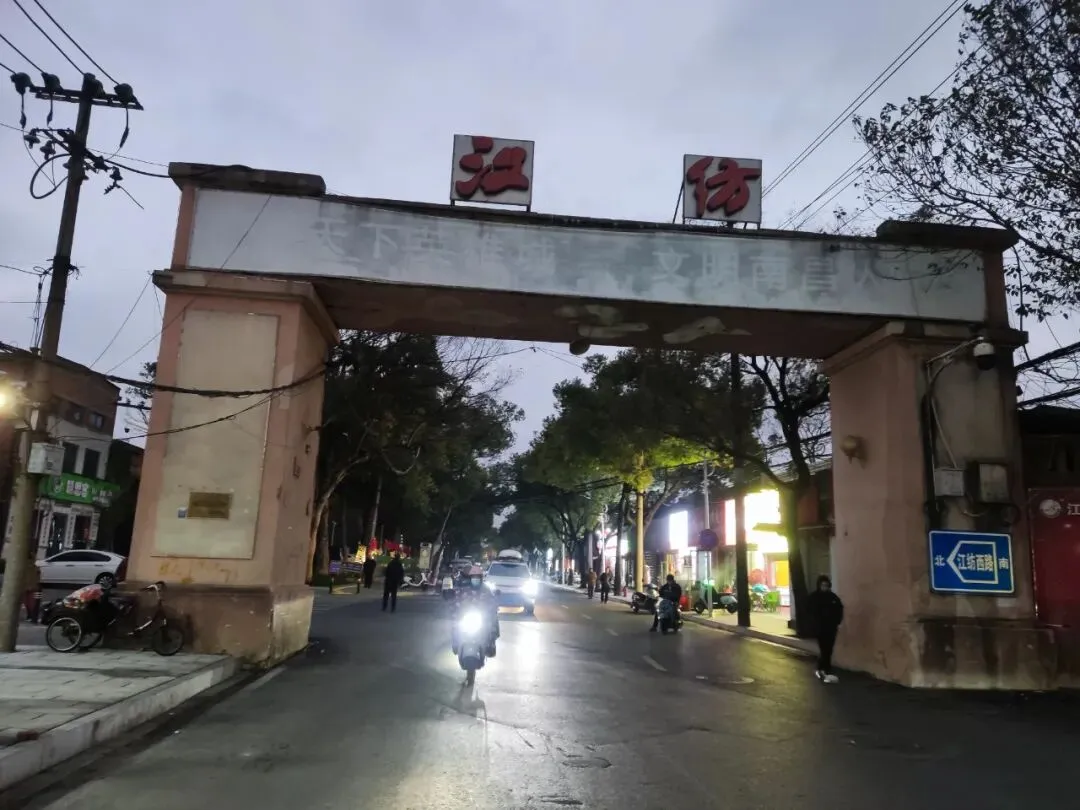 停放好自行车,在拾光小镇参观逗留了半个多小时。看天色已晚,渐次亮起了灯光,只好走了出来。沿江纺厂前路继续西行,不出200米便走出了江纺厂区,承载了南昌人的记忆,见证了江纺历史发展的的江纺(江西棉纺织印染厂)老大门巍然矗立于江纺厂前路最西端。在江纺老大门前面的塘山街路旁小店吃了一大碗热腾腾的鸡蛋肉丝汤面,然后骑车回湾里,到家都8点多了。