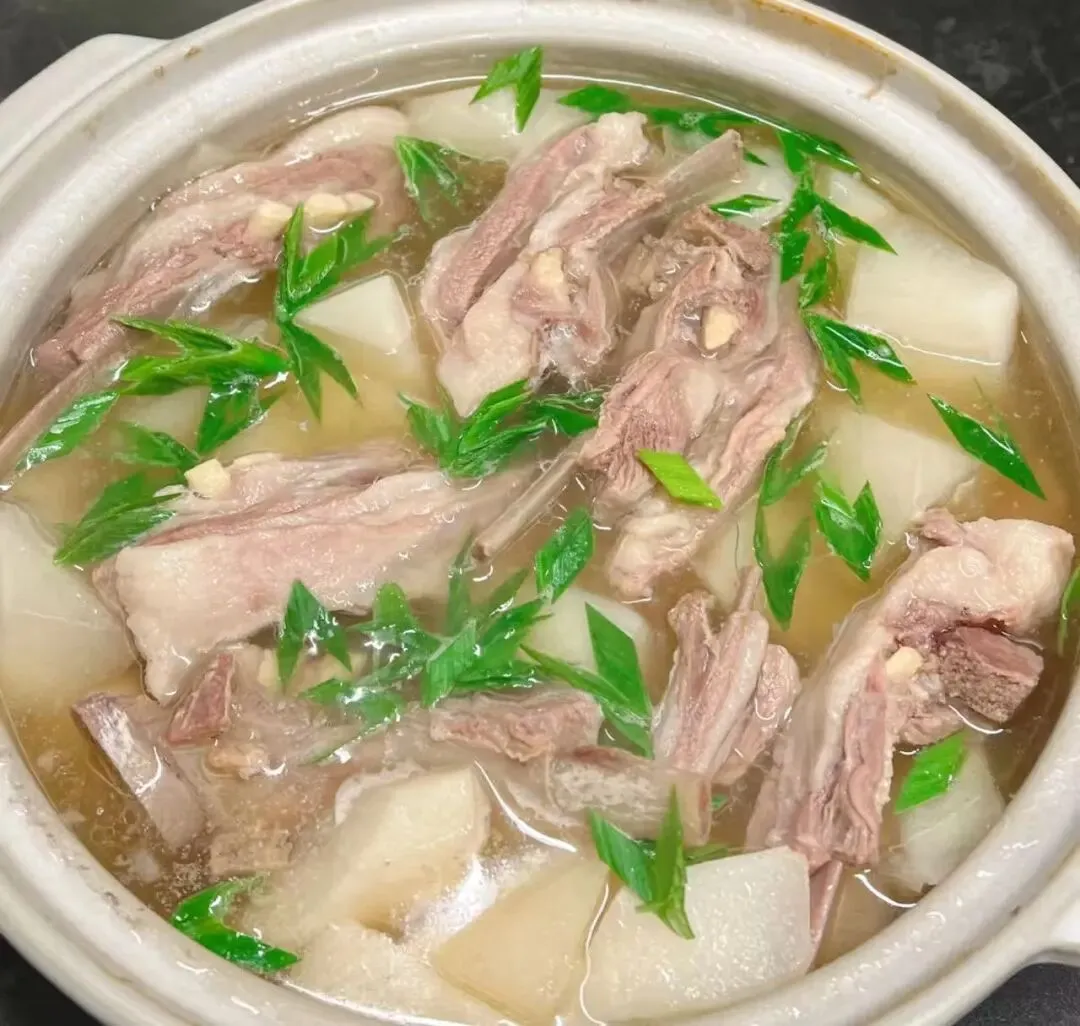 白萝卜烧羊肉,青菜梗炒肉,清炒芽白,紫菜蛋汤,苹果