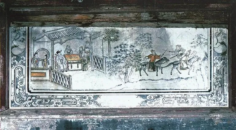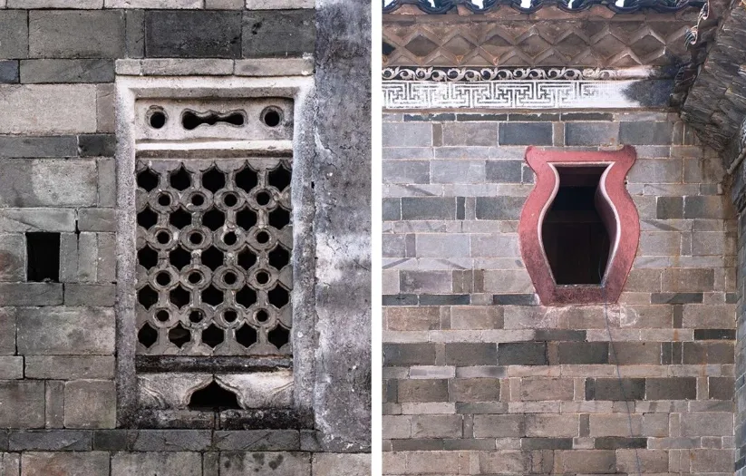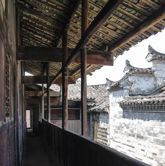 整座建筑的内外风格形成鲜明对比,外墙采用黄泥、沙石、石灰拌红糖、米汤夯筑而成,外观质朴坚固,与普通民居差别不大;内部则极为考究,为砖木结构,墙基、门窗均用花岗岩条石砌筑,部分内墙和门楼采用青砖砌就,一楼通道铺设鹅卵石与青石板,二楼为木质走马楼,回廊曲径通幽,呈现客家 “九井十八厅” 的空间布局特色。其建筑艺术融合了方围、客家天井式、中原府第式与苏杭园林四大风格,窗棂设计尤为精巧,有扇形、菱形、圆形及花篮、花瓶等十多种不同造型的花格窗,即使相同形状的窗户,窗花镂刻也各具特色,每扇内窗几乎都不相同;屋檐采用观音斗拱状结构,墙壁用石灰刷面并绘有以《三国演义》“空城计” 等历史故事为题材的彩绘古画,这些历经百年仍清晰可辨的字画墨宝,对研究清代绘画具有一定价值。