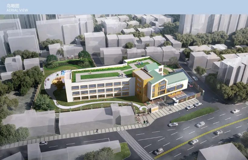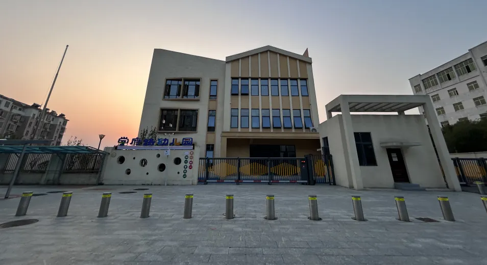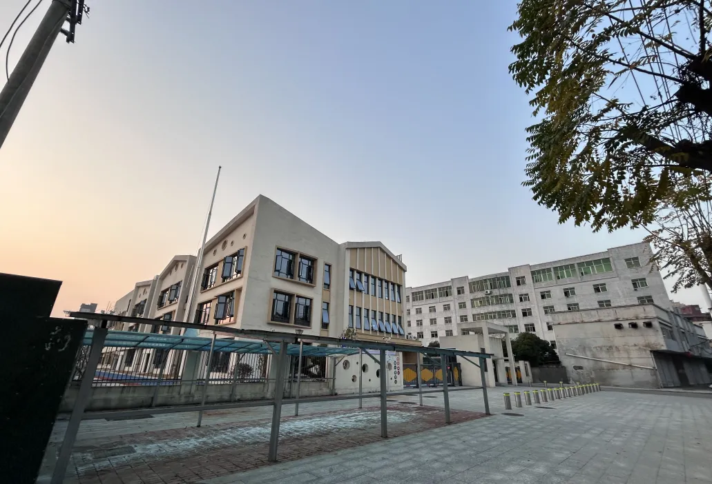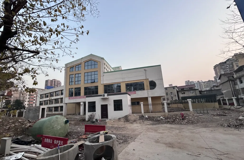 园内教学楼及门卫室已完成装饰配色整体明亮简约,室外道路及活动区已完成铺装,绿化区已栽种绿植并完成亮化工程。