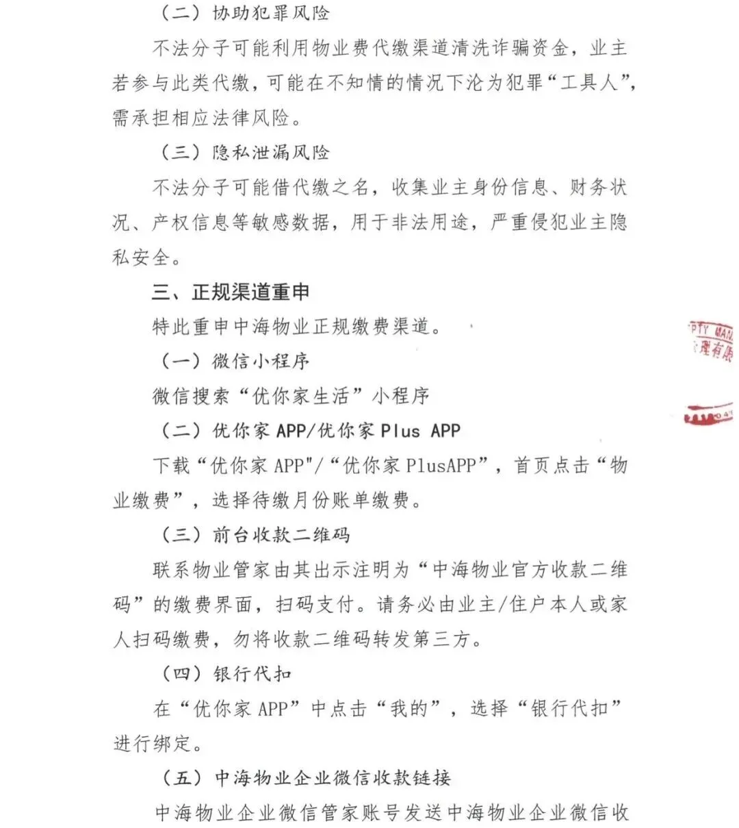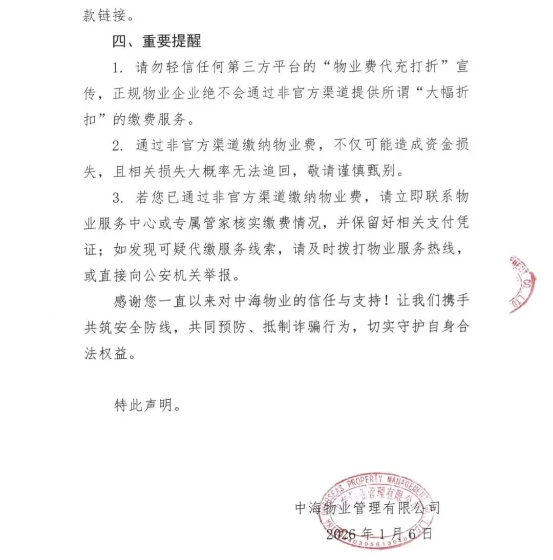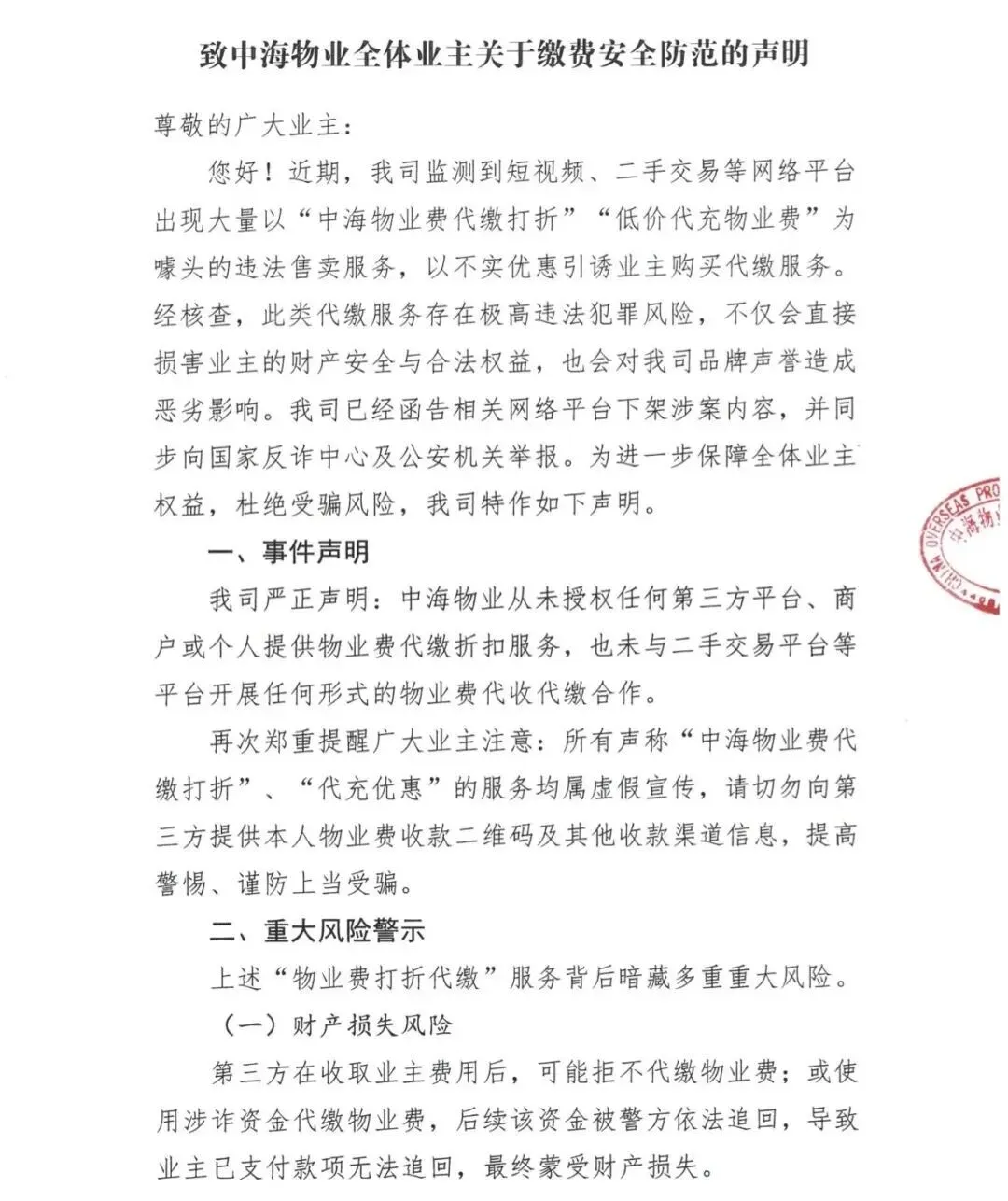 近日,中海物业发布官方声明,在短视频、二手交易等网络平台上,出现大量以 “物业费代充打折”“低价代缴” 为噱头的违法诈骗信息,不仅瞄准了中海业主,更在向其他小区蔓延。这已经不是单个小区的风险,而是一场针对全体业主的诈骗风暴!