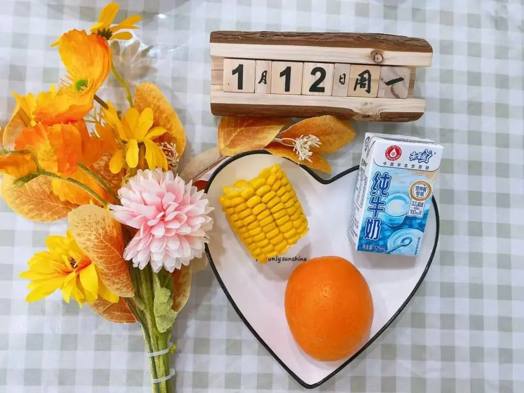 牛奶、蒸玉米、脐橙