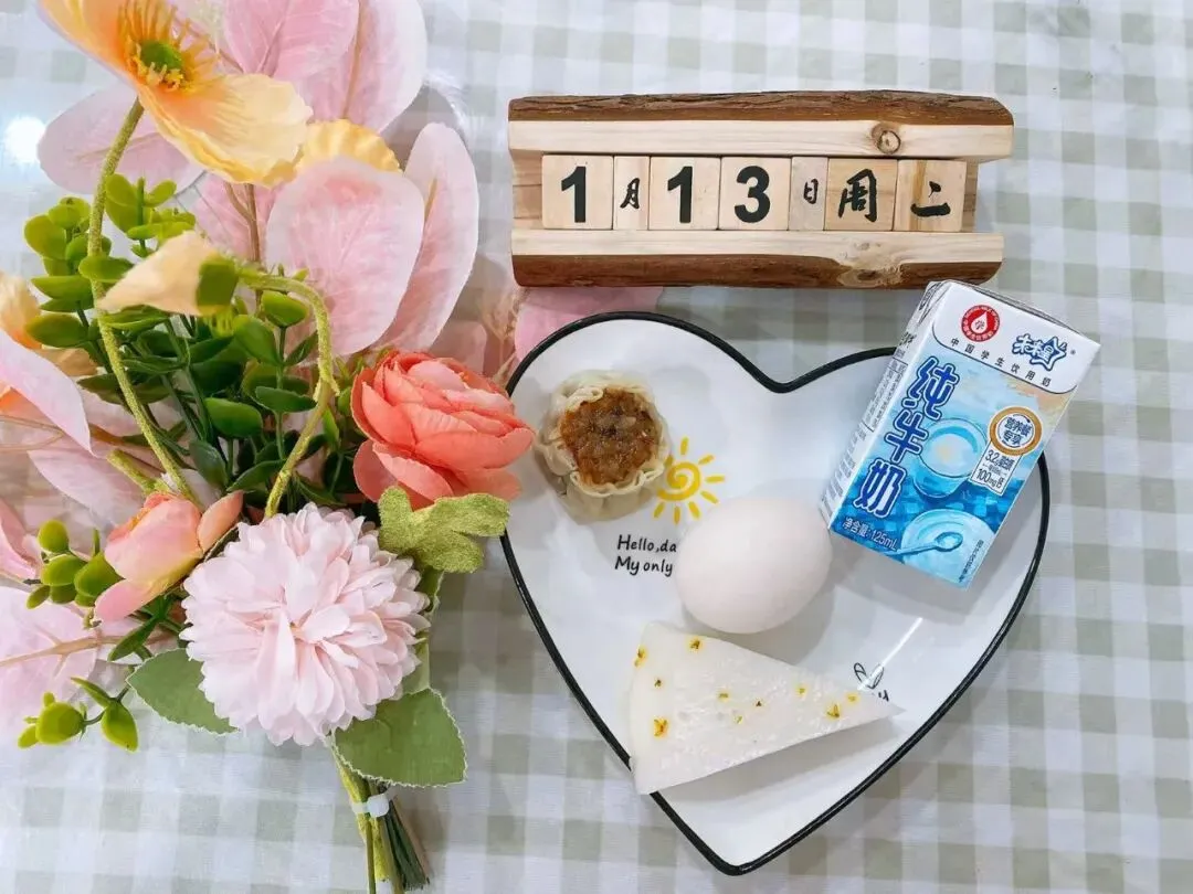 牛奶、桂花糕、糯米烧麦、盐水鸡蛋