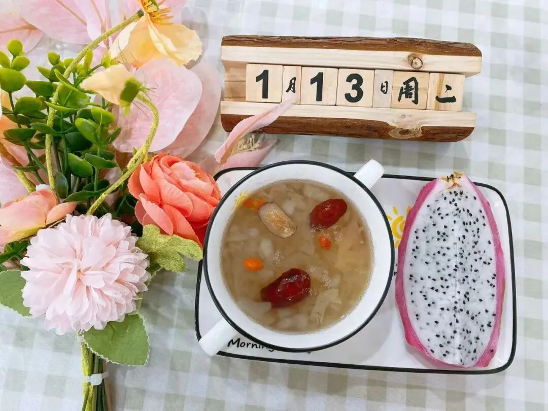 雪梨银耳莲子羹、白心火龙果