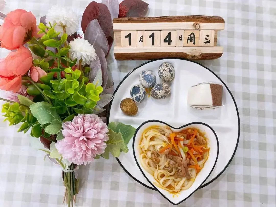 胡萝卜肉丝面、黑米馒头、盐水鹌鹑蛋