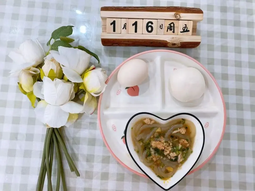 葱花瘦肉红薯粉丝、奶黄包、水煮鸡蛋