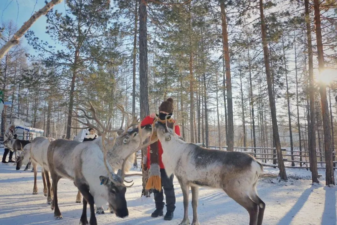 用新鲜的苔藓喂食萌萌的驯鹿