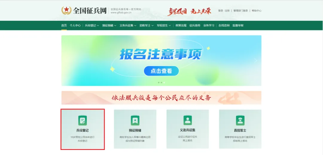 (一)网上注册信息。初次兵役登记主要采取网络登记的方式,男性适龄公民登录“全国征兵网”(http://www.gfbzb.gov.cn/),点击“兵役登记(男兵)”进入页面,进行实名注册,已在“学信网”注册的人员可使用“学信网”账号直接登录。