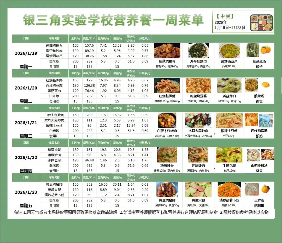 大家好!为了守护每一位师生的舌尖安全,我们每周公示校园餐菜单,确保饮食透明,健康相伴。今天,我们为大家带来本周(1月19日至1月23日)的校园餐精彩预告。
