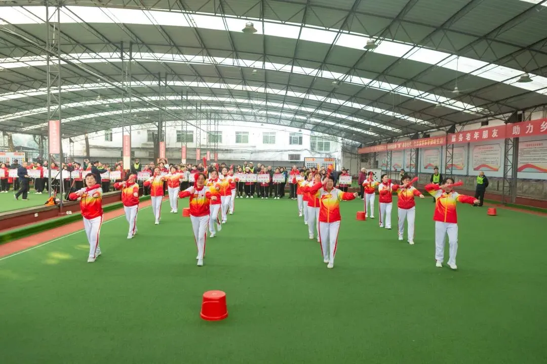 开幕式前,来自市县乡村四级老年体协的近300名运动员献上六道文体展演大餐,为赛事预热添彩。红色横幅在微风中轻扬,场边墨香沁人,八段锦、太极扇舞出刚柔并济的韵律,门球杆划出精准沉稳的弧线。这场门球赛,远不止是一场老年体育的竞技聚会,更是抚州以“体育+”为笔,精心绘制的一幅银发经济与乡村振兴融合发展的新图景。