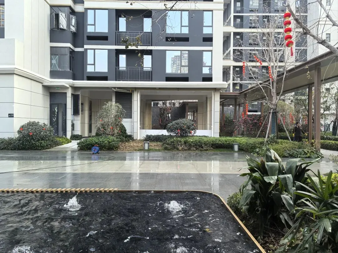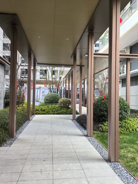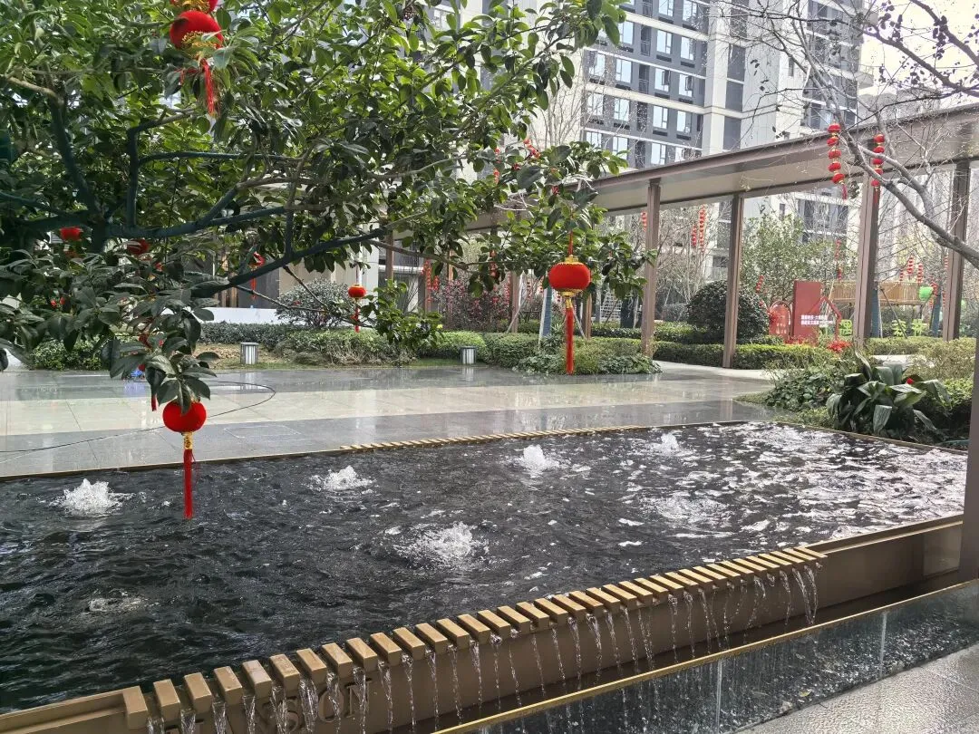 从大门入口进来是一处水景,以及风雨连廊。这也是目前整个小区造景最丰富的一段