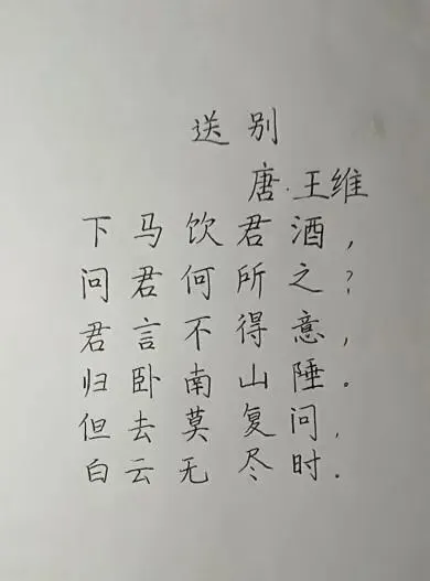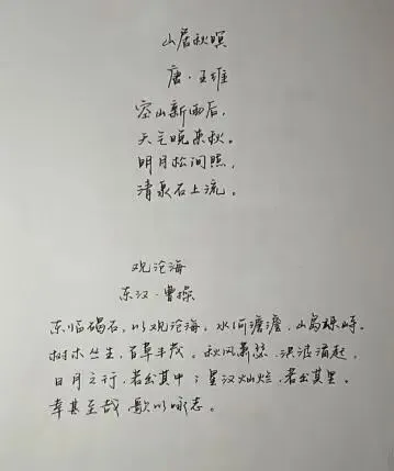 比赛现场暖意融融,笔墨书香扑面而来。一张张铺着A4纸的书桌整齐排列,比赛选手们坐姿端正,握笔凝神,有的低头专注书写,钢笔在纸上留下沉稳有力的笔触;有的不时停顿思索,斟酌字距与行距,力求排版整洁美观。桌案上,一幅幅作品渐次成型:《山居秋暝》的清雅诗句笔墨流畅,字里行间似萦绕着山明水净的秋意,《送别》的暮色苍茫中长亭古道的寂寥清冷,汉字的横平竖直、撇捺舒展在笔下尽显韵味。