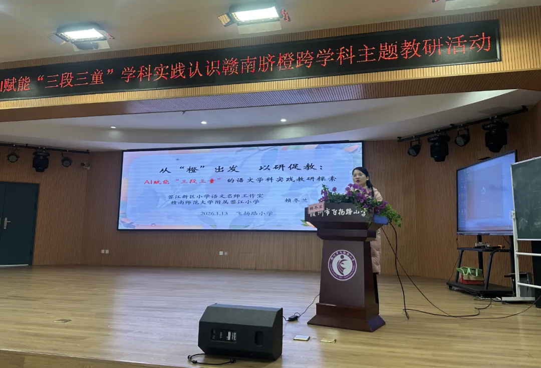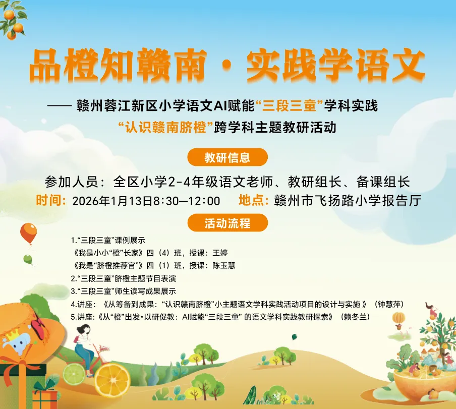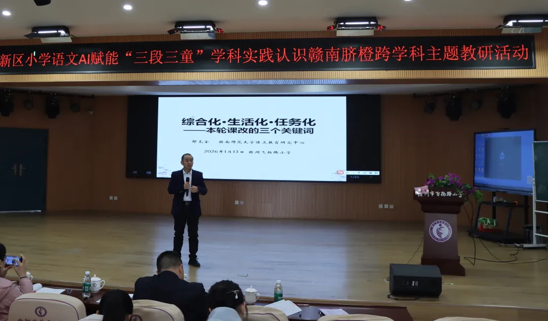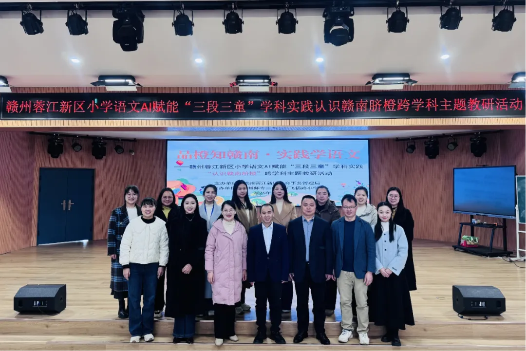 2026年1月13日,赣州蓉江新区小学语文AI赋能“三段三童”学科实践“认识赣南脐橙”小主题教研活动,在赣州师专二附小(飞扬路小学)举行。赣南师范大学语文教育研究中心邵克金博士亲临指导,全区语文教师二百余人参与。