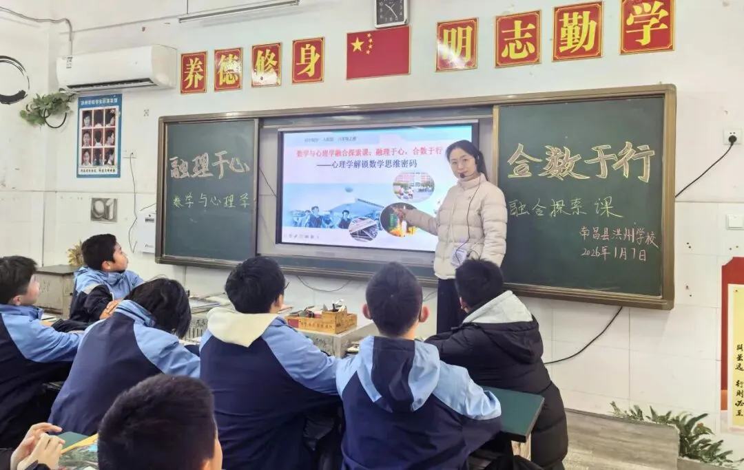 2026年1月7日下午,南昌县洪州学校莲塘校区初二(4)班的教室里掌声与笑声不断,一场别开生面的“心·数同行”融合主题课堂正在这里温情上演。心理辅导中心王晓玲老师将心理学技巧巧妙融入全等三角形、分式运算等数学重难点教学,用趣味互动拆解学生的数学学习“心壁垒”,让原本略显枯燥的数学课堂,充满了知识碰撞与心灵滋养的双重温度。