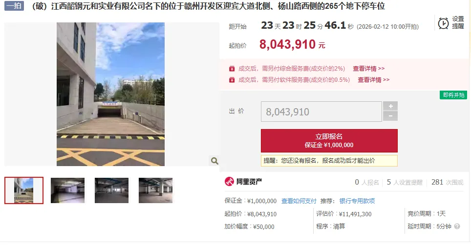 江西韶钢元和实业有限公司名下的位于赣州开发区迎宾大道北侧、杨山路西侧的265个地下停车位。