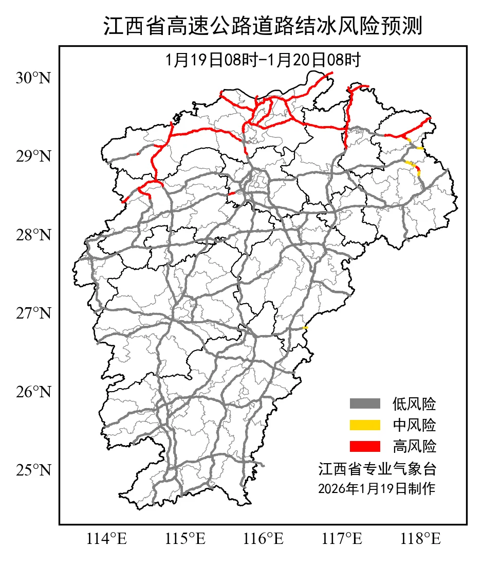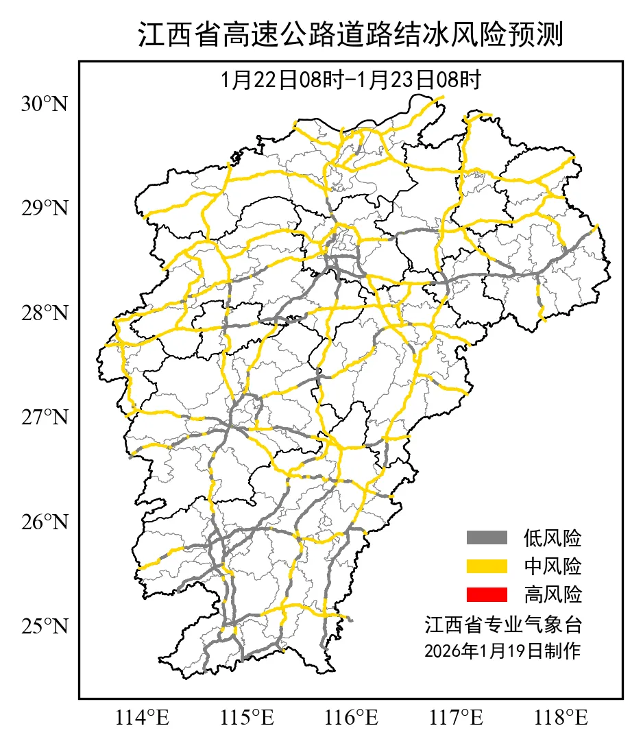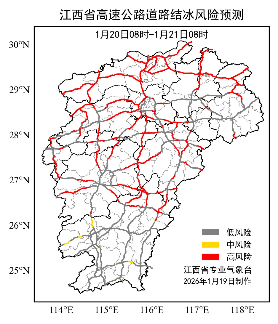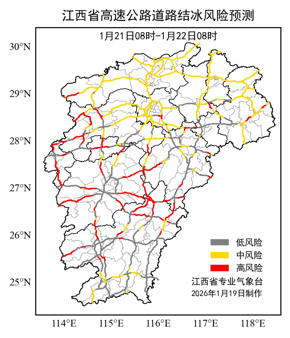 1月21日08时至1月22日08时受雨雪冰冻影响的高风险路段主要涉及南昌市、九江市、萍乡市、新余市、鹰潭市、赣州市、宜春市、上饶市、吉安市、抚州市10个地市、18个路段:
