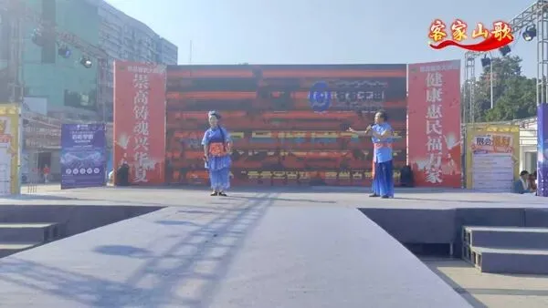 两位身着蓝布客家服饰的表演者,用原汁原味的客家方言演唱山歌。婉转的唱腔、浓郁的乡土气息,既展现了赣州本土的文化特色,也让观众感受到客家文化的独特魅力。