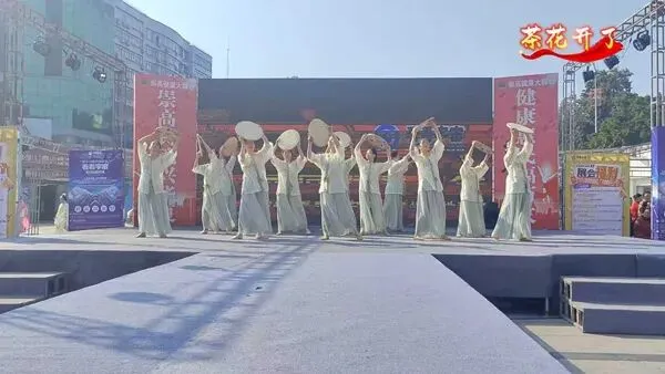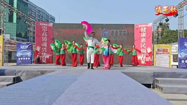 赣南采茶舞风格的表演,舞者们手持花扇,用俏皮舞步演绎《请茶歌》里的客家热情。