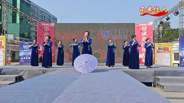 蓝白渐变服饰搭配红绸扇,以赣南采茶戏的俏皮舞步唱出丰收的喜悦。