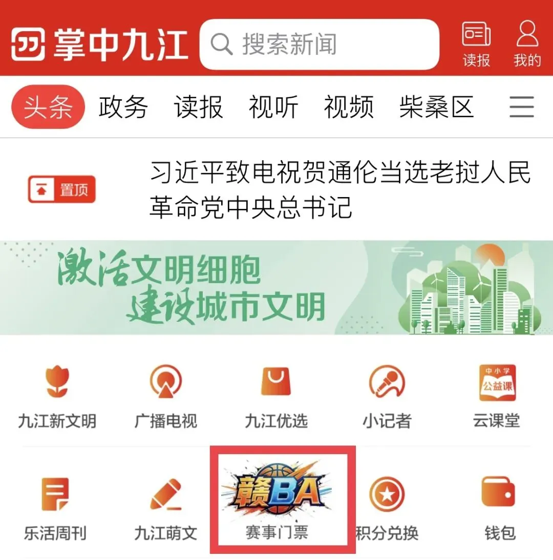 1.打开掌中九江App首页,点击“赣BA赛事门票”