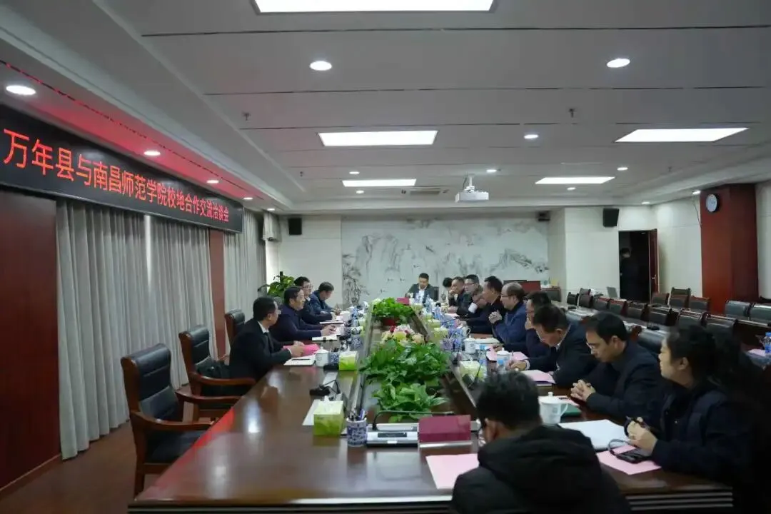 1月19日,万年县与南昌师范学院校地合作交流洽谈会在南昌师范学院昌北校区举行。双方围绕深化校地合作、推动文旅产业融合与创新发展进行了深入交流与探讨,旨在充分发挥高校智力资源优势,服务县域经济社会高质量发展。南昌师范学院党委书记王金平,南昌师范学院校长杜建强,万年县委书记余华阳,县委常委、宣传部部长张晨辉出席会议。