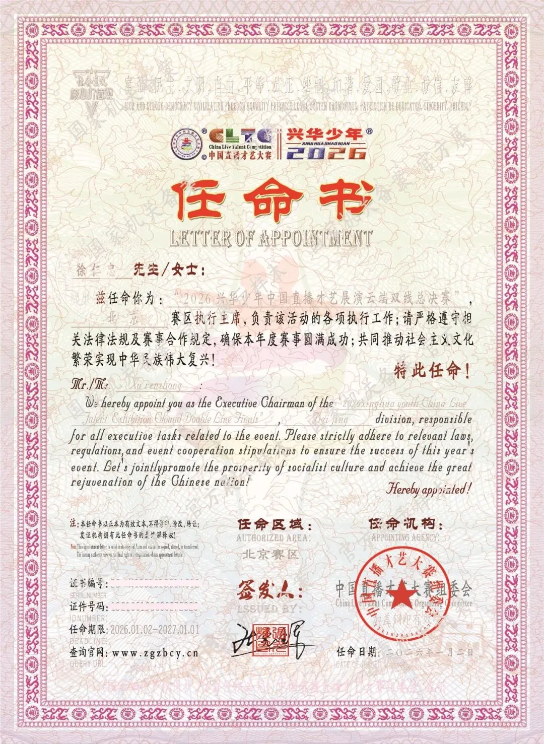 任命书证样