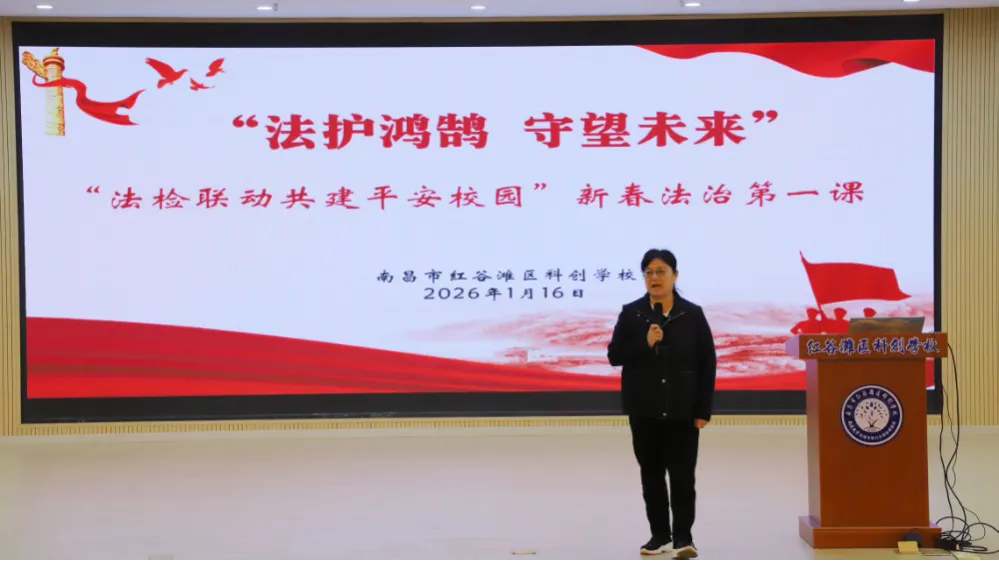 冬阳送暖,法润心田。2026年1月16日下午,南昌市红谷滩区科创学校迎来了一场别开生面的“新春法治第一课”。以“法护鸿鹄 守望未来”为主题,南昌市中级人民法院少年庭庭长周兵,南昌市新建区人民检察院党组成员、副检察长涂阳,红谷滩区人民法院少年家事审判庭负责人王志明一行与科创学校的师生们齐聚一堂,共同开启了一段充满温度与启迪的法治之旅。