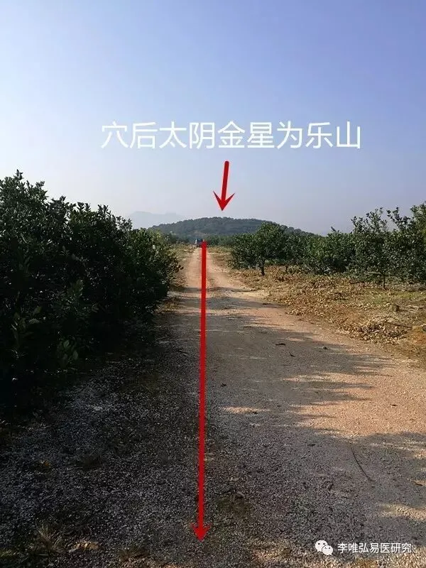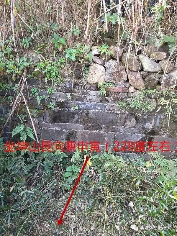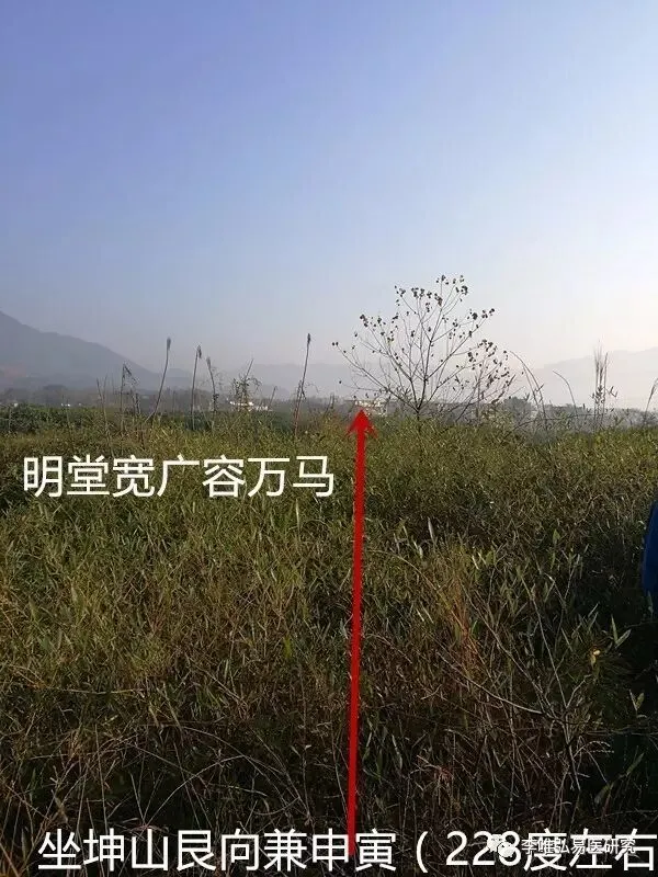 测得墓坐坤山艮兼申寅(228度左右)。属于横龙结穴,廖公(廖金精)云:“横龙穴后必要鬼,乐星宜后峙”,恰穴后约500米有一太阴金星为乐山,证得穴真,喝形:伏地虎形,穴在虎头,乐山恰是虎屁股,由于年代变迁,现在已经看不出虎形的全貌,当年杨公喝形伏地虎,一定有他的道理。左水到右,来水子兼癸,去水口卯兼乙。